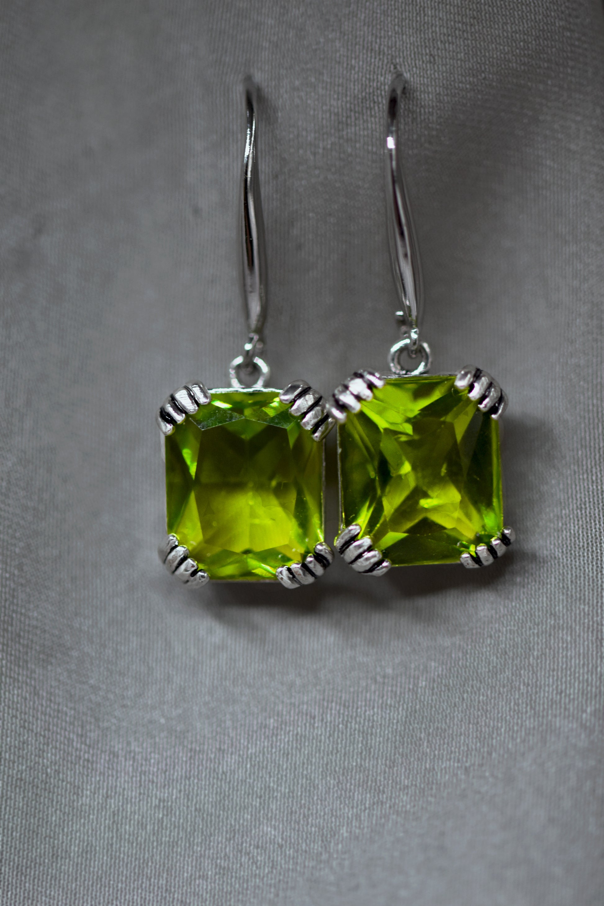 Description: These Large Peridot Earrings have a Detailed Design of 2,90 carat Oval Cut Yellowgreen Peridot per earring (5,8 ct in total), set in 92,5% Fine Silver. Their square cut makes the earrings perfectly combine with our square Peridot neckless.