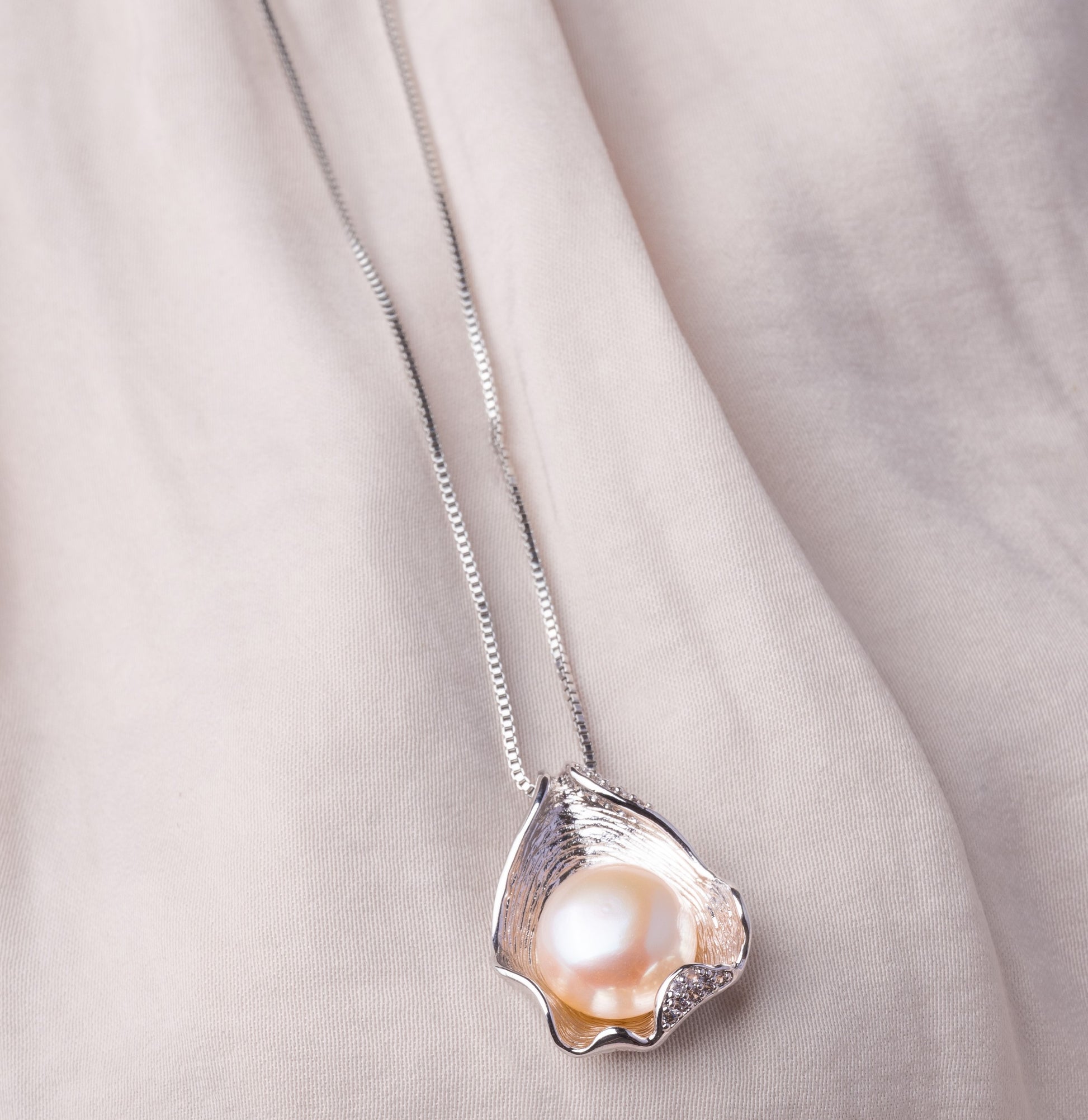 Beschrijving: Deze echte roze parelketting is gemaakt van een grote zoetwaterparel van 10,3 mm. De parelketting met geometrische zilveren 925 sterling zilveren schelp wordt geleverd met de bijpassende fijne sterling zilveren ketting van 45 cm. De parel heeft een ronde, afgeplatte vorm, een hoge glans en een natuurlijke ivoorwitte kleur.