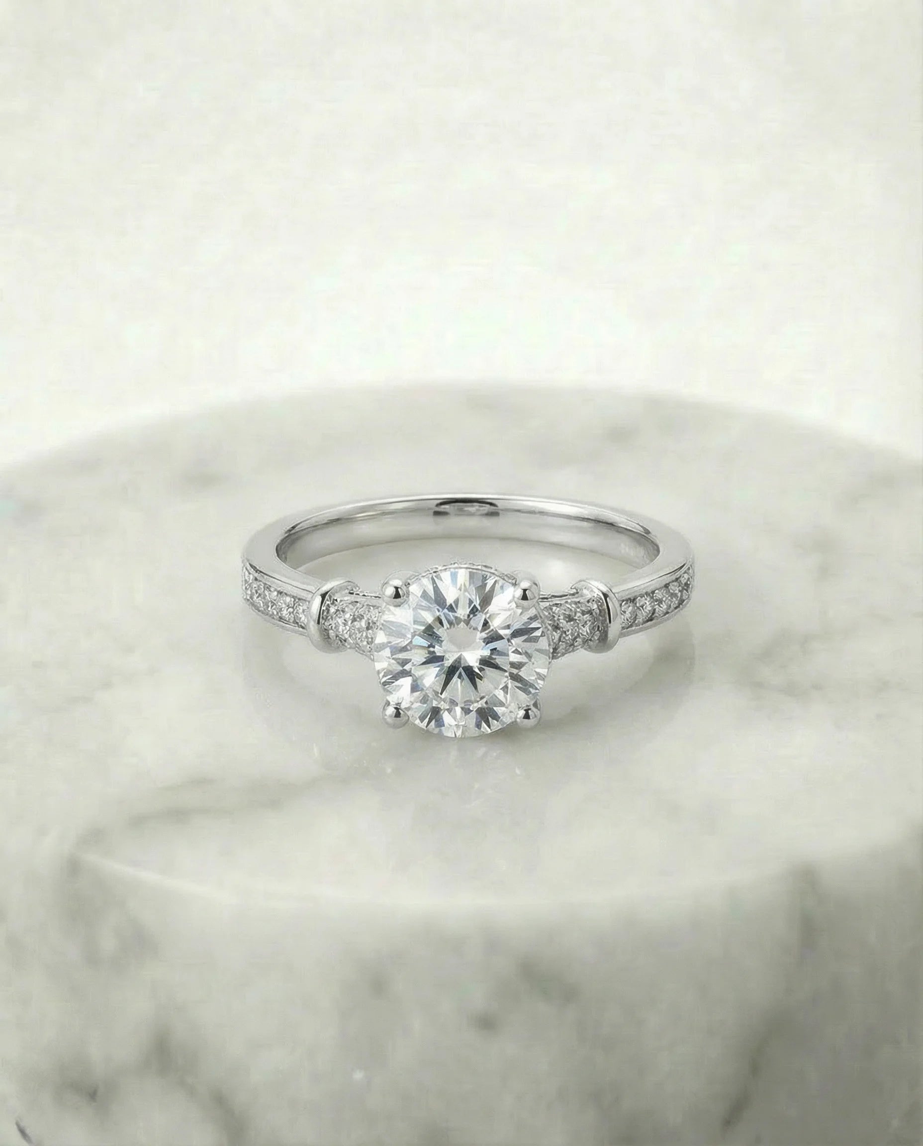 Description: This eye catching ring has a 1.0 carat Brilliant cut simulated diamond as the center gem. The gem is set in a crafted solid 92.5% pure silver band with smaler quality round cut simulated diamond on each side.