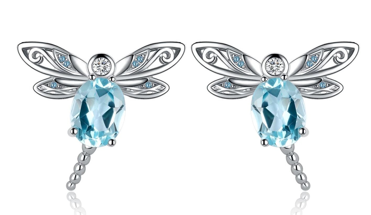 Description: These Pretty Blue Topaz Dragonfly Stud Earrings feature a Natural 2,35 Oval Round Cut Topaz from Brazil as its Main Gemstone per earring (4,7 carat in total). The Sky Blue Topaz is set in 92,5% Pure Silver with Six Simulant stones.This set of Earring will make you look adorable.