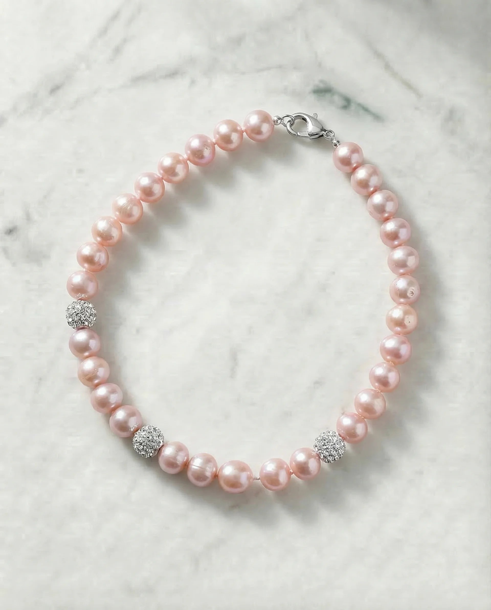 This authentic pink pearl necklace features genuine freshwater pearls paired with sparkling zircon accents. The lustrous pink pearls are carefully matched and strung on a durable thread, creating a graceful piece that catches light beautifully.