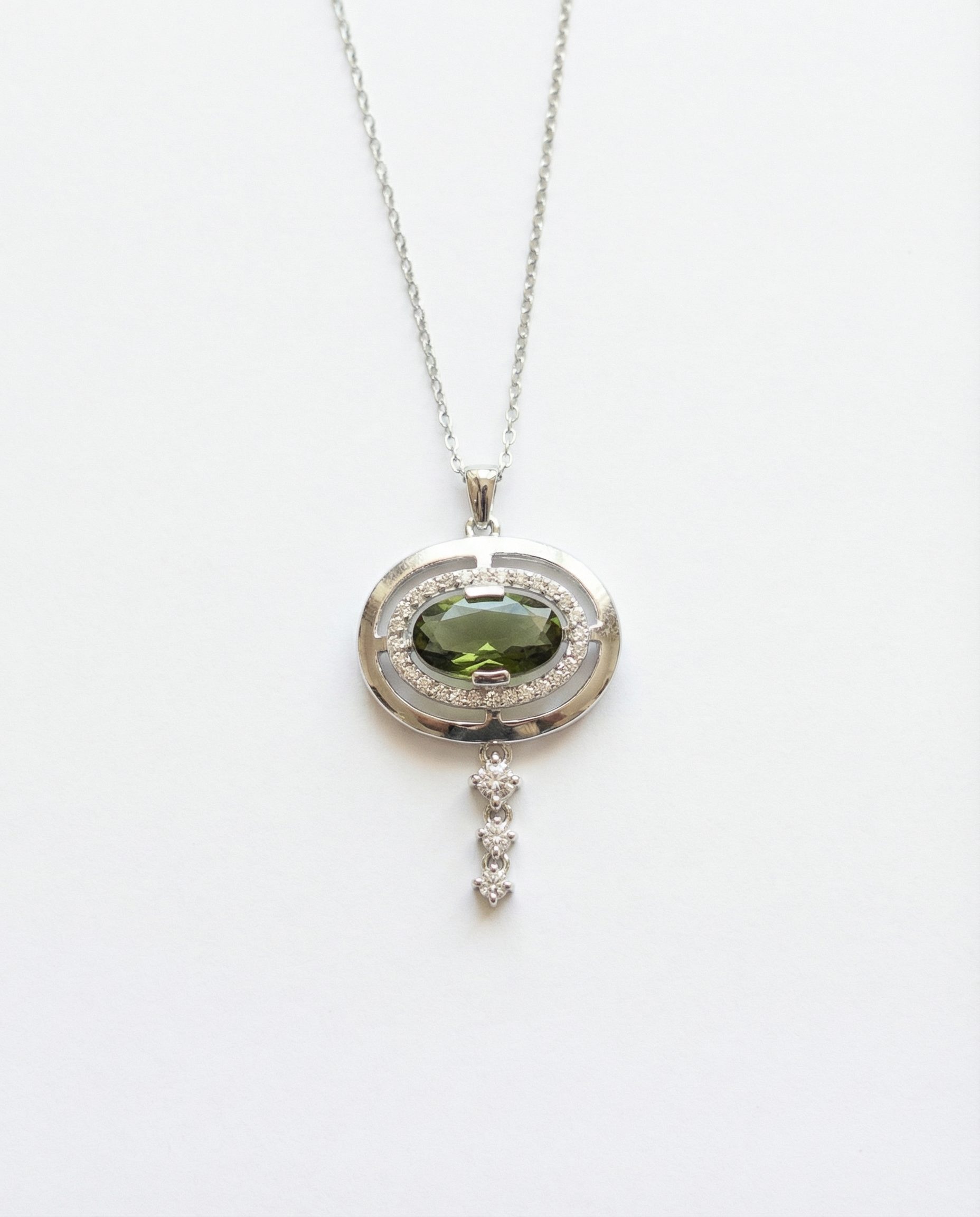 To maintain the sparkling green color of your Peridot and the brilliance of the silver, we recommend removing the necklace before swimming, showering, or using cleaning products.