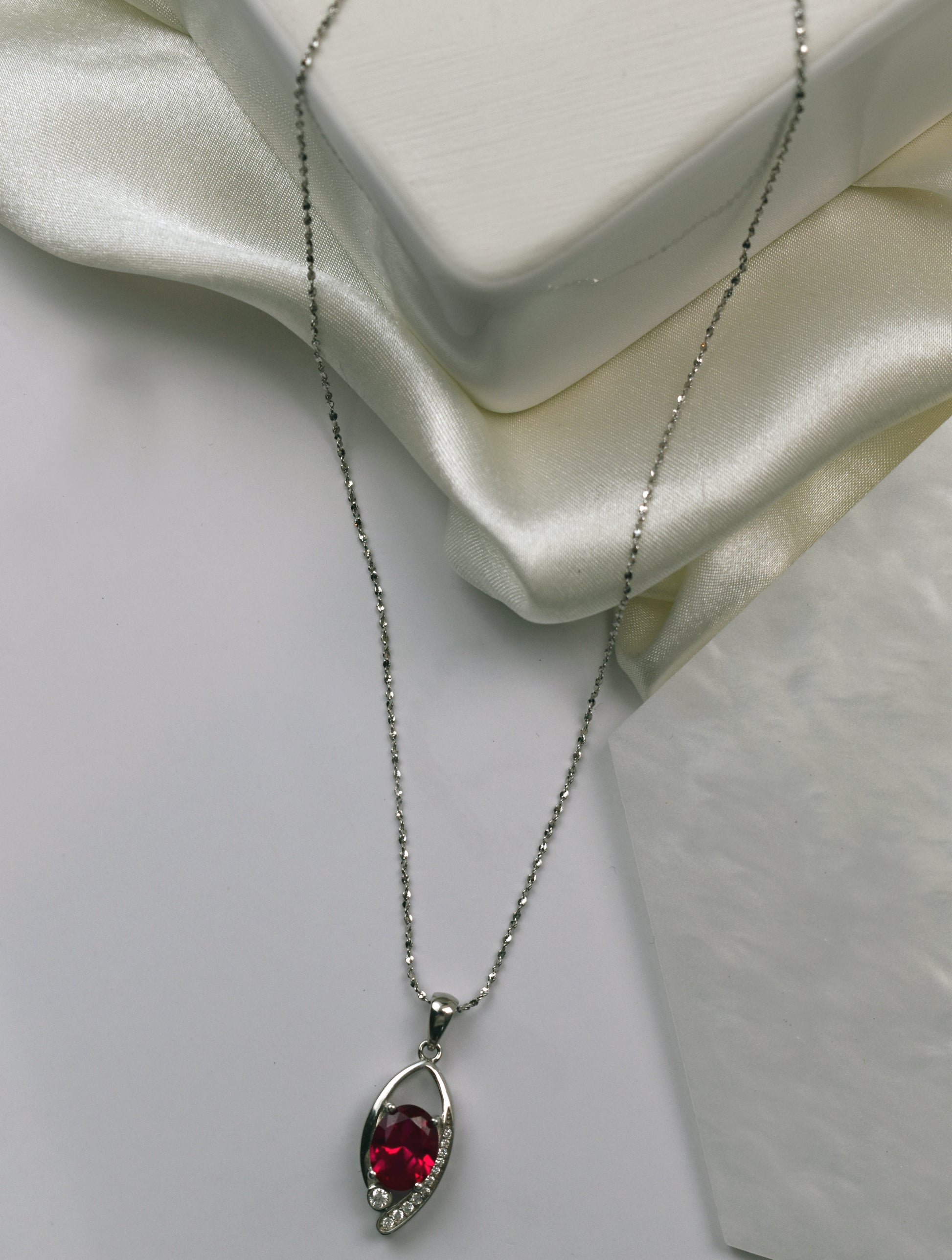 Description: This Garnet Pendant Necklace is Designed to make You Feel Like a Princess. It is inspired by the Jewelry of British Royalty such as Princess Diana and Princess Kate. The Vibrant Red 2.6ct Oval Cut Garnet and 11 Diamond Simulants on the side are set in 92,5% Pure Silver and come with the displayed 45cm fine silver chain.
