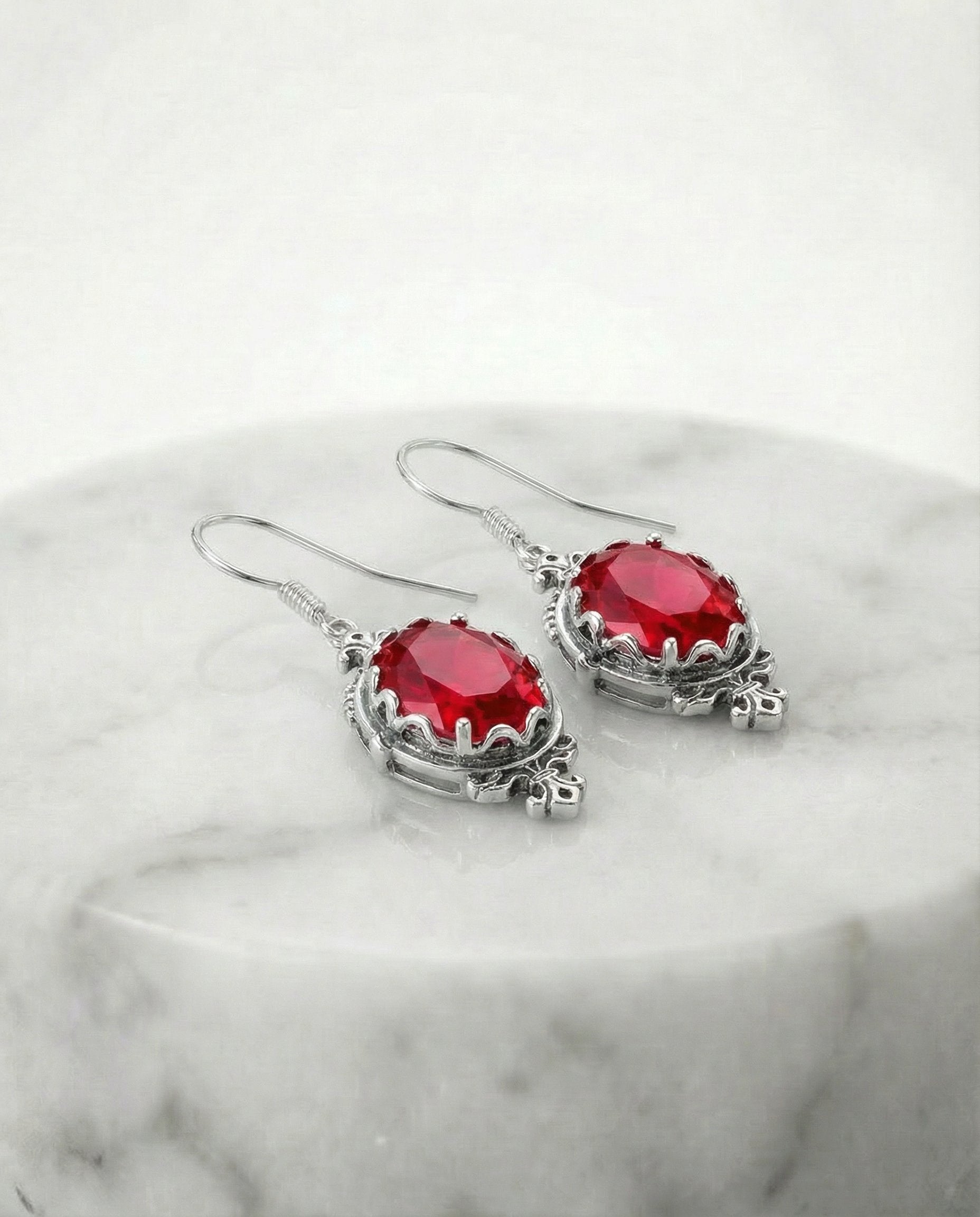 Each earring features a generous 2.7-carat oval-cut ruby, beautifully set in 925 sterling silver to enhance its deep red glow.