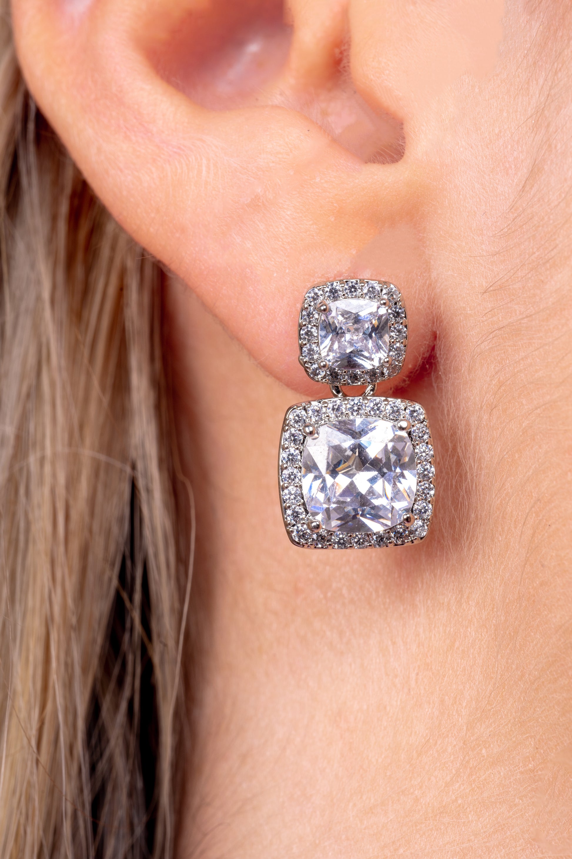 Description: These Square Cut Simulated Diamond Earrings feature a Beaming 1,5 carat Square Cut Diamond Simulant each with a 1 carat Princes Cut Diamond Simulant placed above the gems per earring (5ct in total). Surrounded by smaller simulated diamonds of each 92,5% fine silver earring, creating a Reflective Spectacle to the eye.